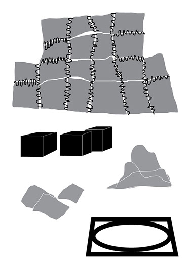 Une vingtaine de coussins sont cousus ensemble pour former une masse dans laquelle se noyer, se cacher, se camoufler. 4 poufs apportent un éléments solide et servent de rangement. D'autres coussins individuels servent encore le jeu des acteurs ainsi que des plaids. RING ﷯